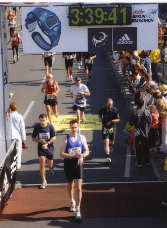 Das Jahr 2003 hat sich für mich zu einem reinen Laufjahr entwickelt. Zuerst sollten einige große Duathlons auf dem Programm stehen. Leider hat die Zeit zum Training nicht gereicht. Deshalb habe ich mich ganz auf das Laufen konzentriert. Mit dem Alter wird man ruhiger und geht auch lockerer an die ganze Sache ran. Als Saisonabschluss stand der Berlin Marathon auf dem Programm. Es war mit dem Wetter während der Vorbereitungszeit der 12 Wochen eine echte Qual. Diese Hitze, die mir gar nicht liegt, hat mir richtig zugesetzt. Sie hat mir auch das eine um das andere Mal den Spaß an der Sache verdorben. Bei meiner Vorbereitung habe ich mir die Aufzeichnungen der Vorjahre zur Grundlage genommen. Ich wollte diesmal weniger trainieren und mit einem passablen Ergebnis aus der Sache heraus gehen. Dann war der Tag des Marathon gekommen. In aller Frühe machte ich mich auf den Weg, um einen günstigen Parkplatz zu bekommen. Der Start war vor der Siegessäule, dann ging es durch Moabit Richtung Mitte am Fernsehturm vorbei, kurz durch Kreuzberg und Neukölln über Steglitz und dann wieder zurück über den Kuhdamm, Poda Platz, Unter den Linden und durch das Brandenburger Tor ins Ziel, welches sich gleich dahinter befand. Der Lauf war mal wieder eine Katastrophe, es waren viel zu viele Menschen auf der Laufstrecke. Das ganze Knäuel hat sich erst nach 25 km gelockert, aber voll war es trotzdem noch. Dann waren da immer die Läufer, die irgendwie nach vorne durch wollten. Da musste man aufpassen, dass man nicht getreten wird. Bis zum früheren Ziel auf dem Kuhdamm lief ich auch ganz gut, dann kam aber irgendwie der moralische Wendepunkt. Vielleicht weil man mit diesem Ort auch das Ziel verbindet. Weiterhin musste ich feststellen, dass auf dem Kuhdamm wieder einmal die beste Stimmung war. Danach auf den letzten Kilometern, fehlte einfach das Publikum. Zwar war die Strecke hier auch reizvoll, dies wurde aber durch die flache Stimmung an der Strecke getrübt. Sogar Unter den Linden war die Stimmung nicht toll, da war auf dem Kuhdamm mehr los. Das beste sind die Zielfotos im Hintergrund das Brandenburger Tor. Ich hatte weiterhin noch am Berlincup teilgenommen und einen unerwarteten 3. Platz in meiner Altersklasse belegt. Hier sind die Läufe noch übersichtlich. Es zeichnet sich allerdings auch ein Trend zur Überfüllung der Läufe ab. Da müssten so manche Veranstalter schon längst die Bremse ziehen und die Läufe auf die Laufstrecke angepasst limitieren. So habe ich dann mein Laufjahr 2003 abgeschlossen und bin in die wohlverdiente Ruhepause getreten.